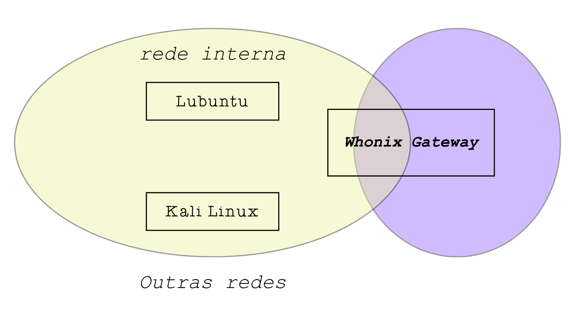 O cenário é um laboratório controlado, composto por três máquinas: um Whonix Gateway, que será o roteador e ponto de saída Tor da rede; um Kali Linux, que vai atuar como atacante; e um Lubuntu, simulando uma estação de trabalho comum, conectada à rede interna. A proposta é explorar um ataque clássico de ARP spoofing, mas adaptado ao ambiente virtualizado e roteado do Whonix.
